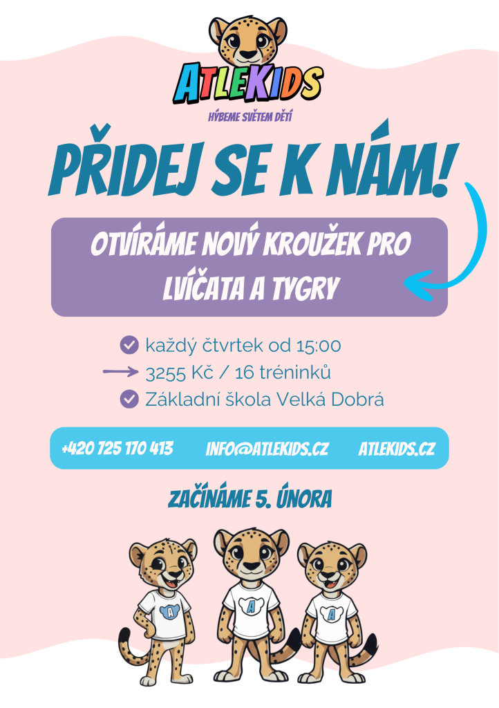 V tělocvičně naší škole bude od 5.2.2026 probíhat kroužek Atlekids. Veškeré informace vč. ceny naleznete na webových stránkách: https://atlekids.cz/